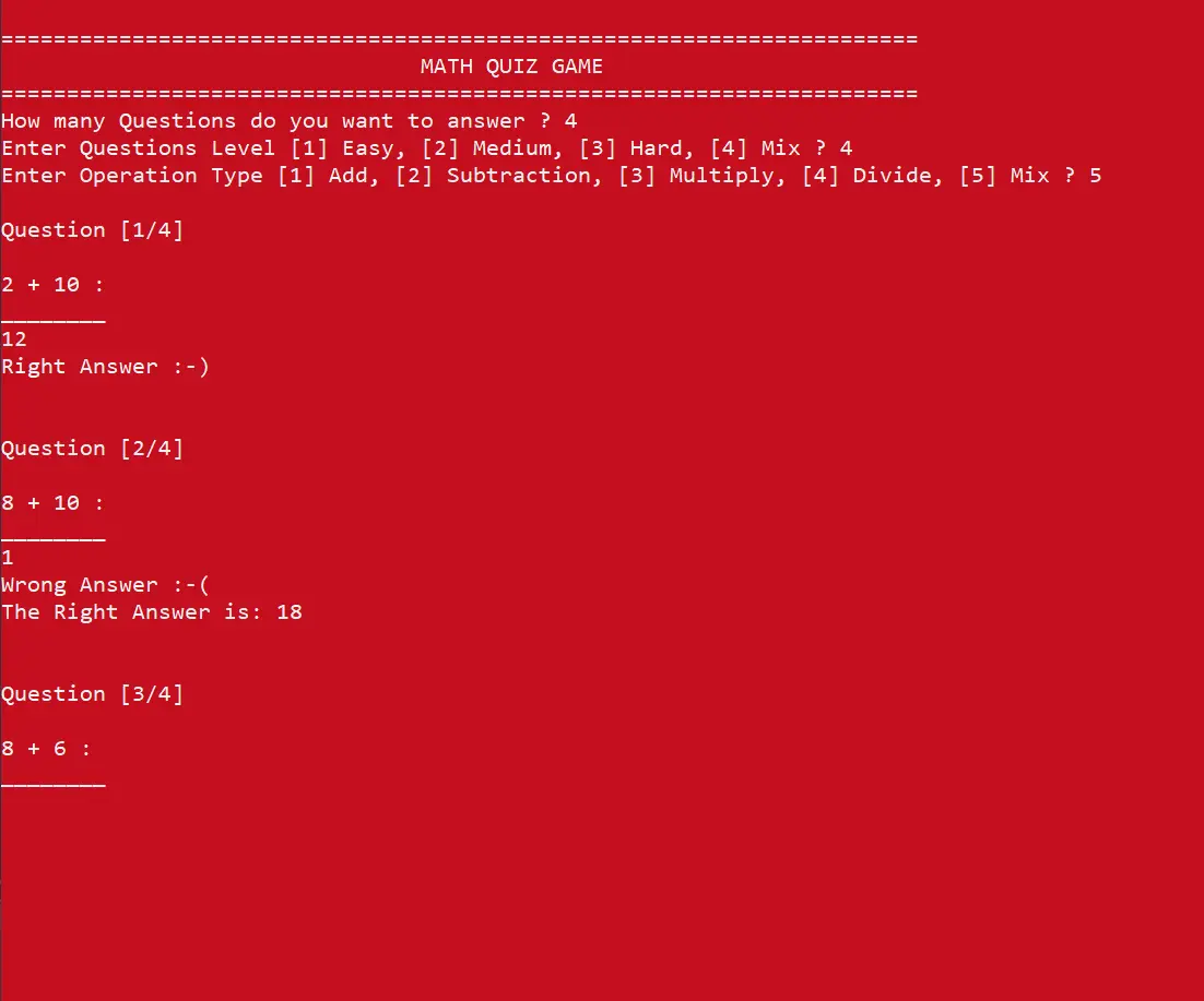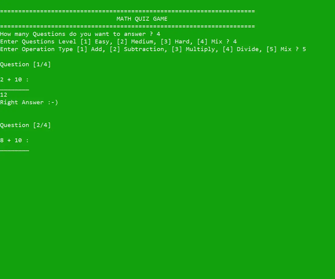 This project was created to practice problem-solving, random generation, and data handling. It allows the player to choose the number of questions, difficulty level, and operation type before starting the quiz. The game calculates results instantly and displays a final report at the end of each session.