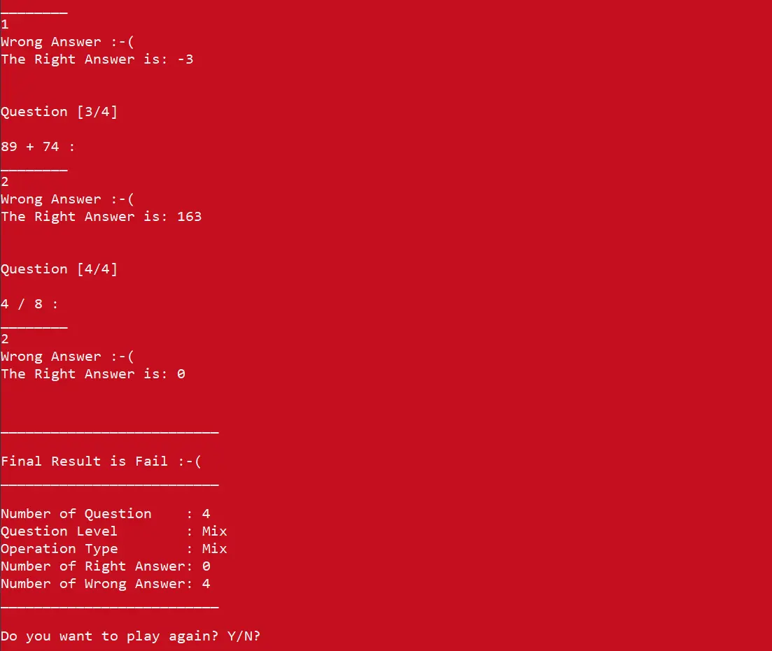 - Color Feedback: Console colors change for correct and wrong answers to enhance interactivity.