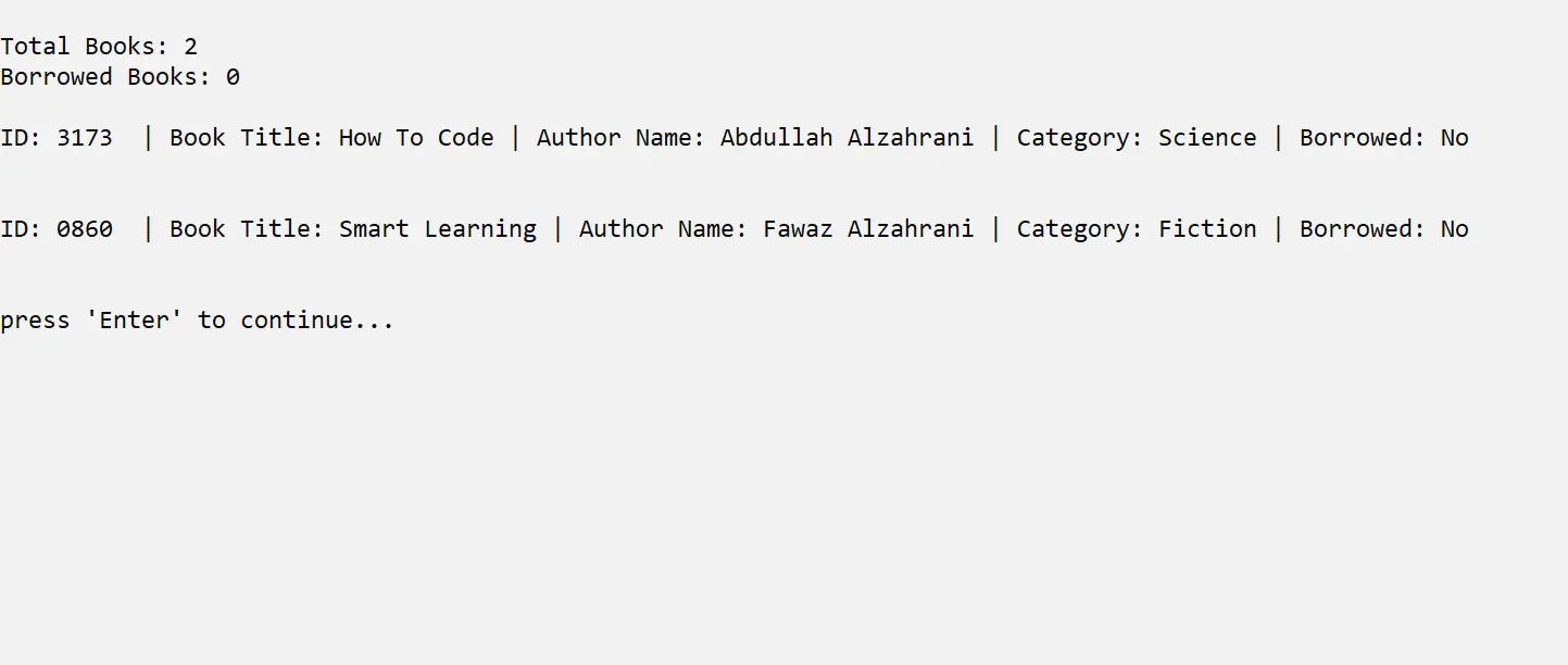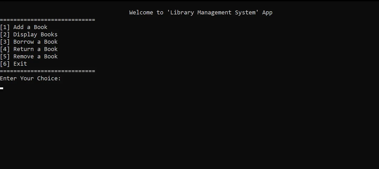 The Library Management System is a console application for organizing books in a small virtual library. It allows users to add, display, borrow, return, and remove books with real-time status updates.