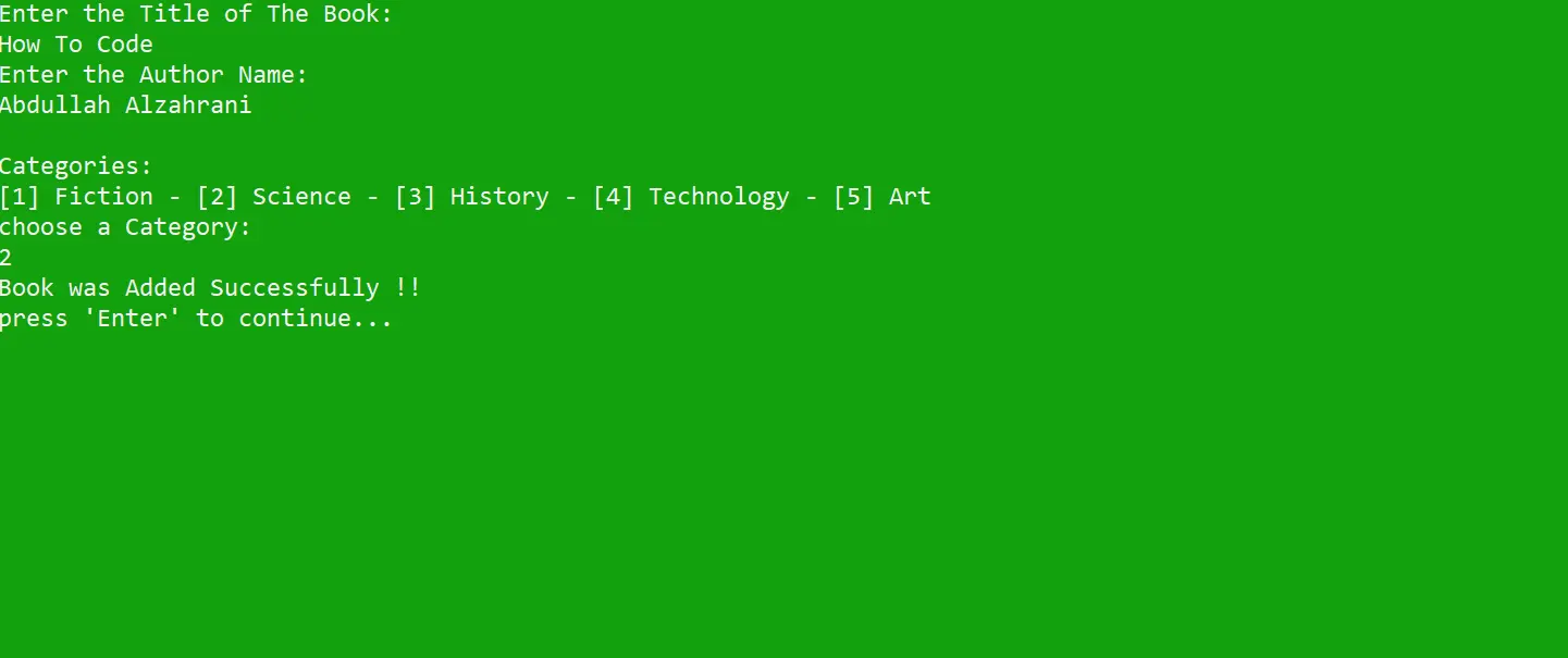- Add Books: Register new books with a random ID, title, author name, and category.