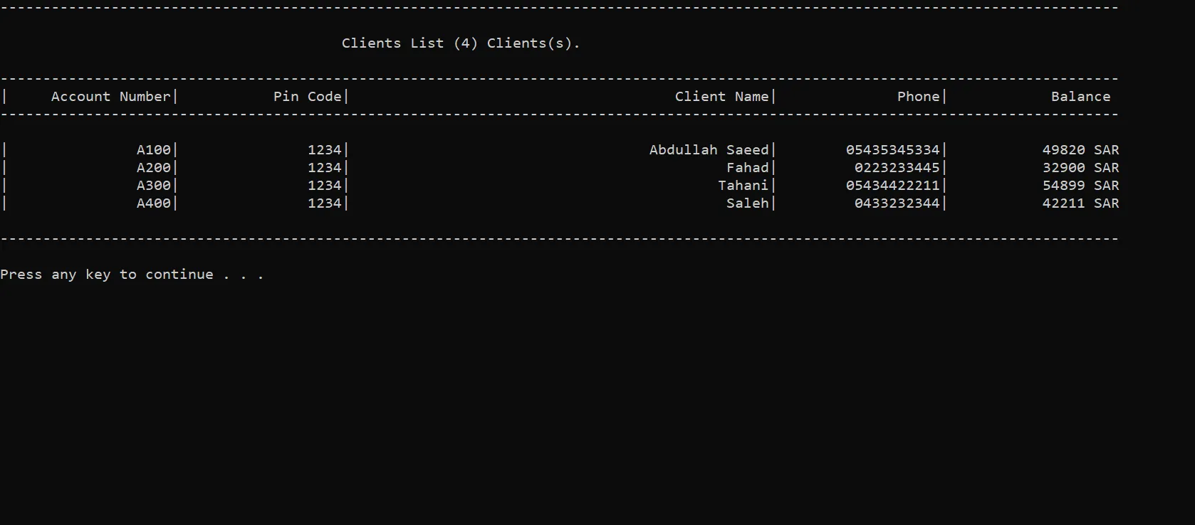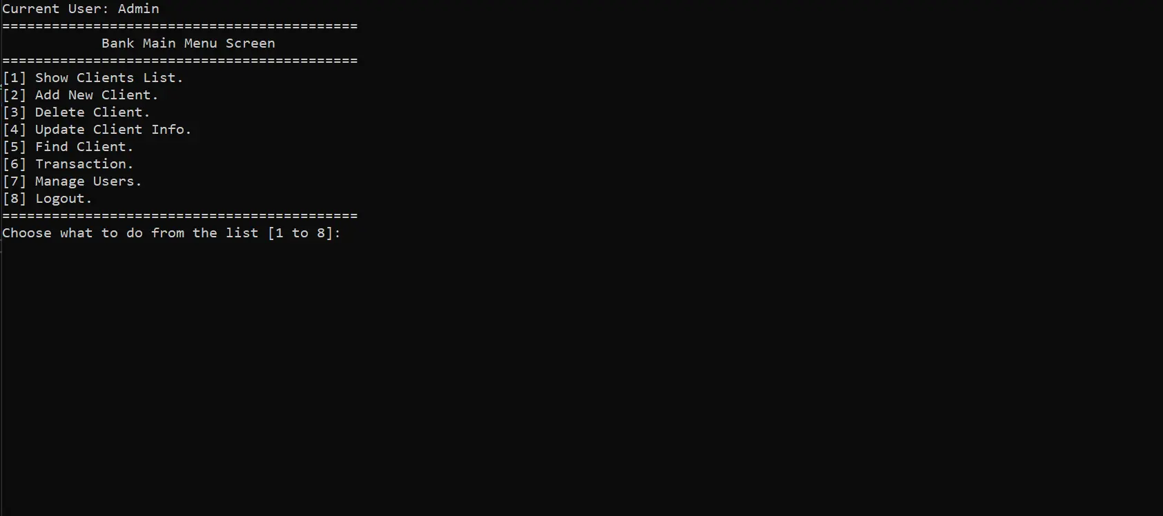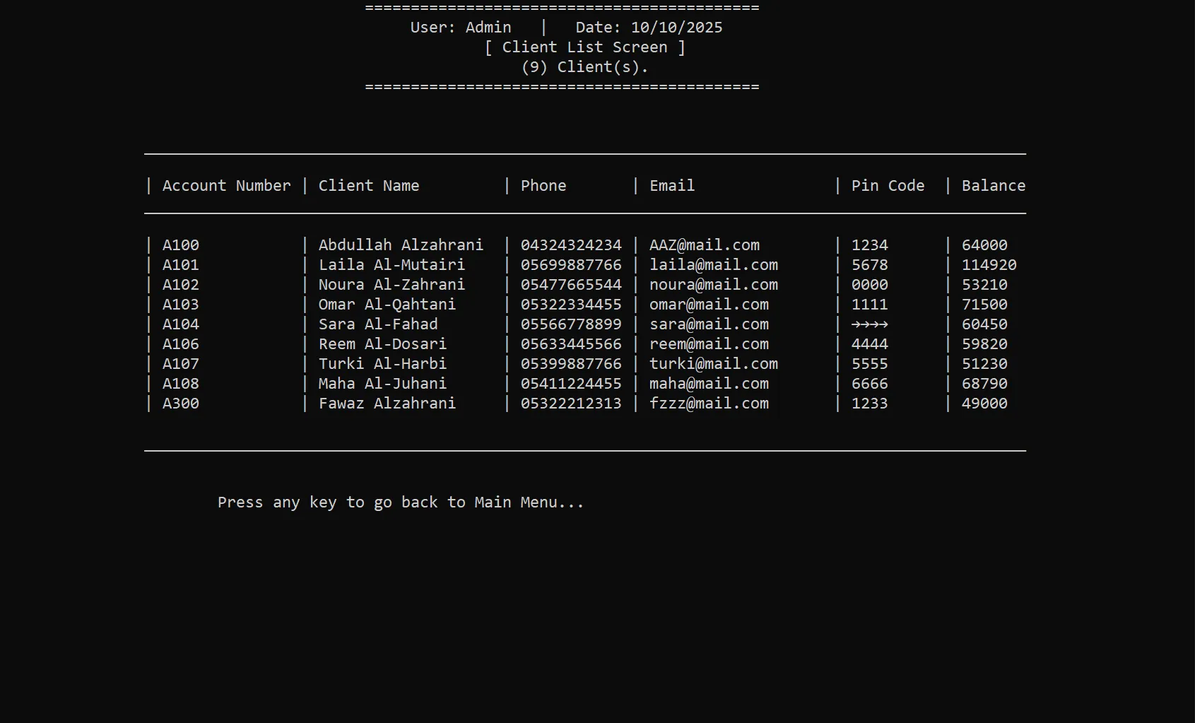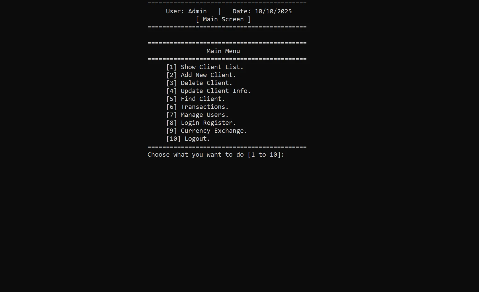 A structured OOP-based banking system that manages clients, users, transactions, and currencies with file-based storage and secure user authentication